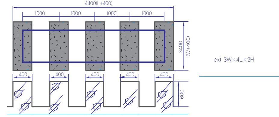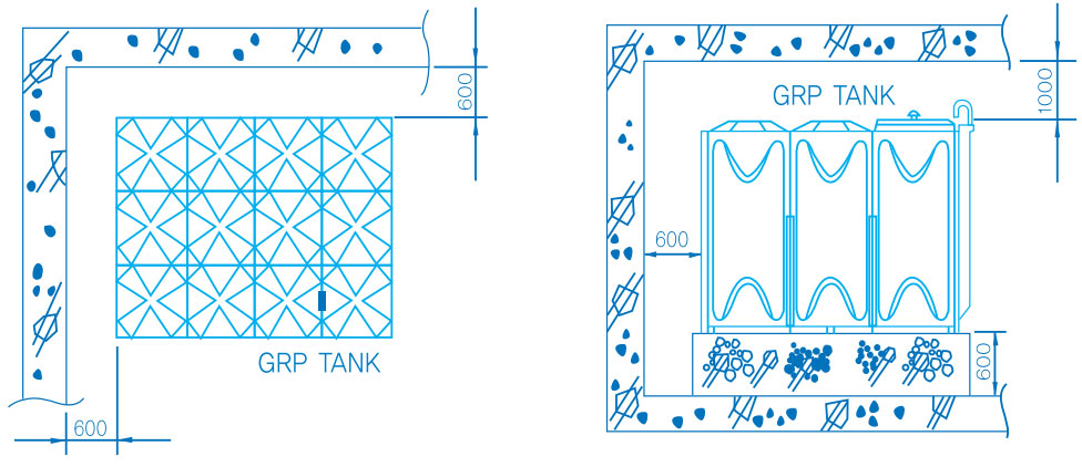 A space for 600mm apart from the walls in four directions (1000mm for the upper part) is required for the installation of a tank and for its inspection & maintenance.
